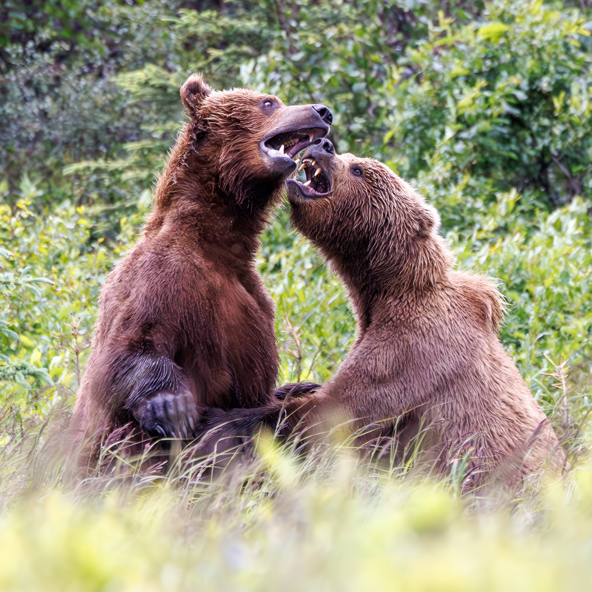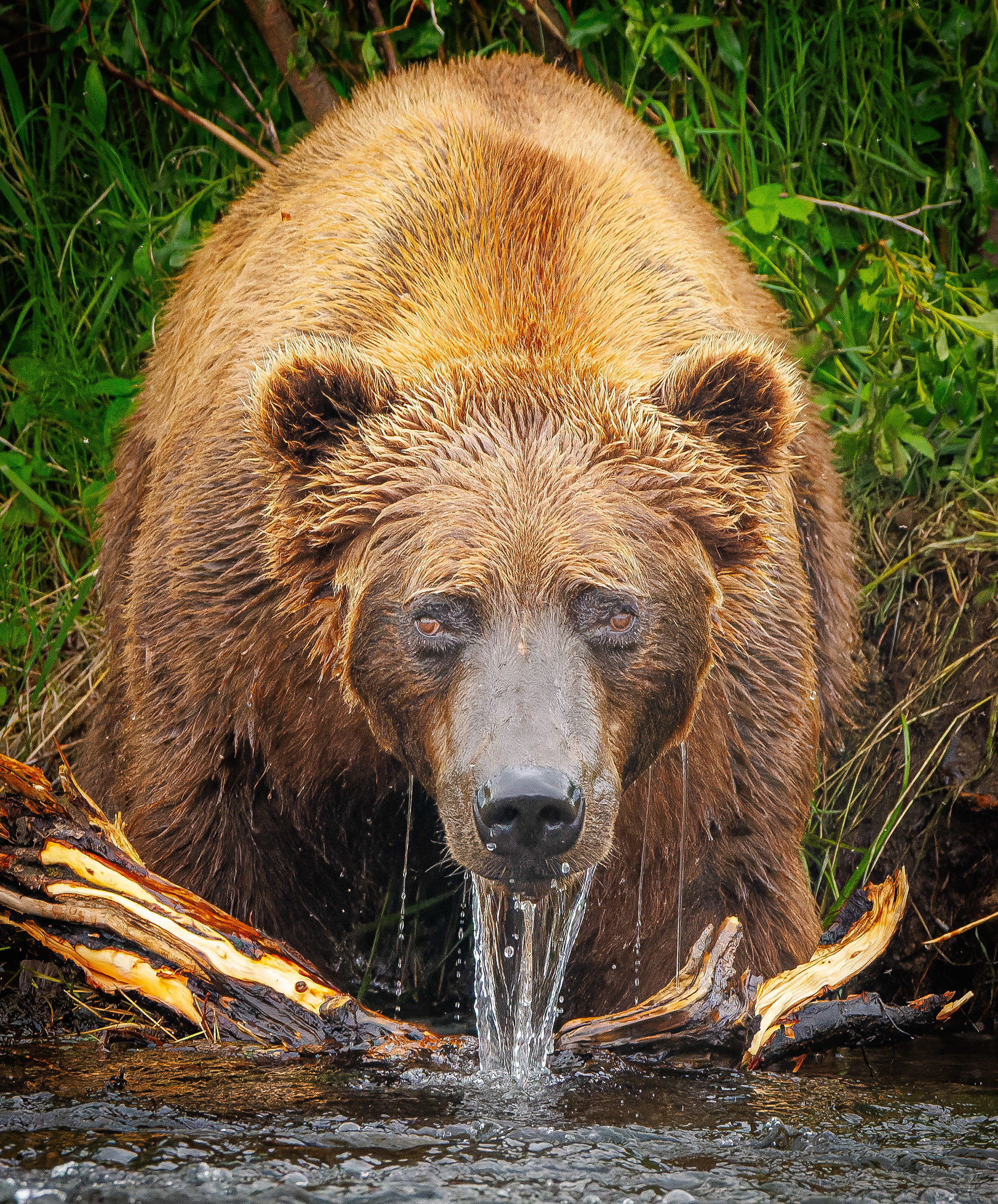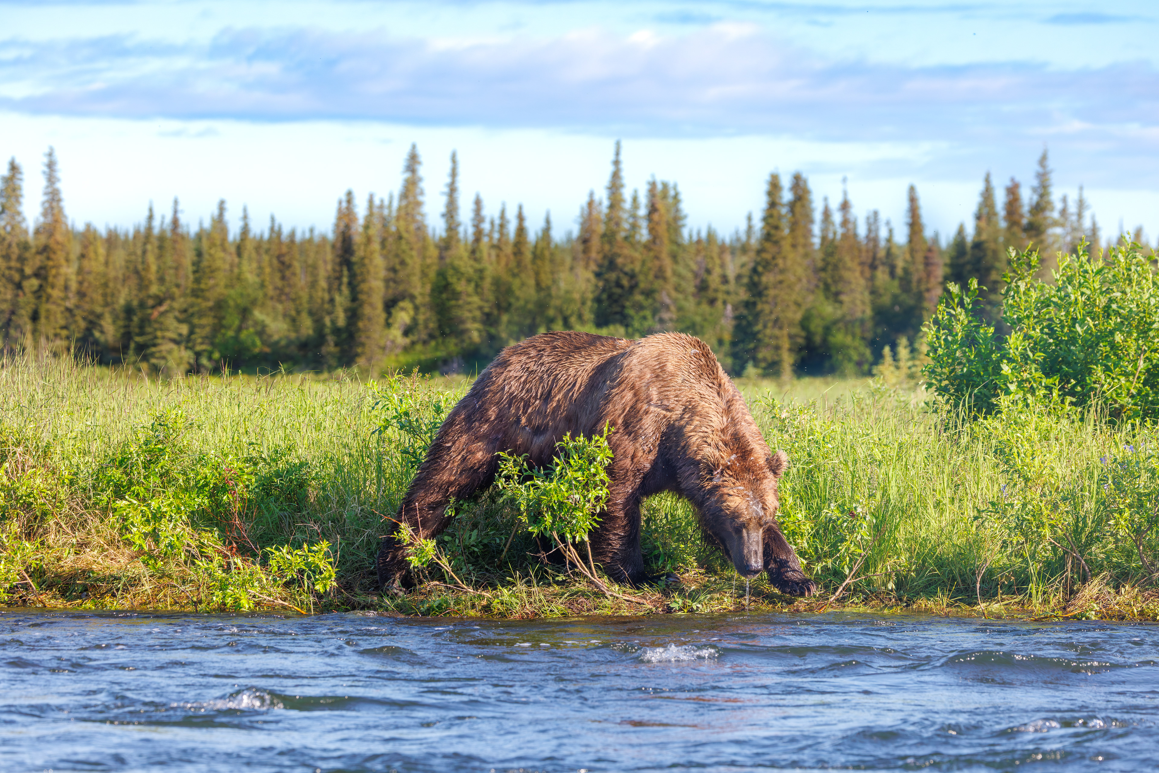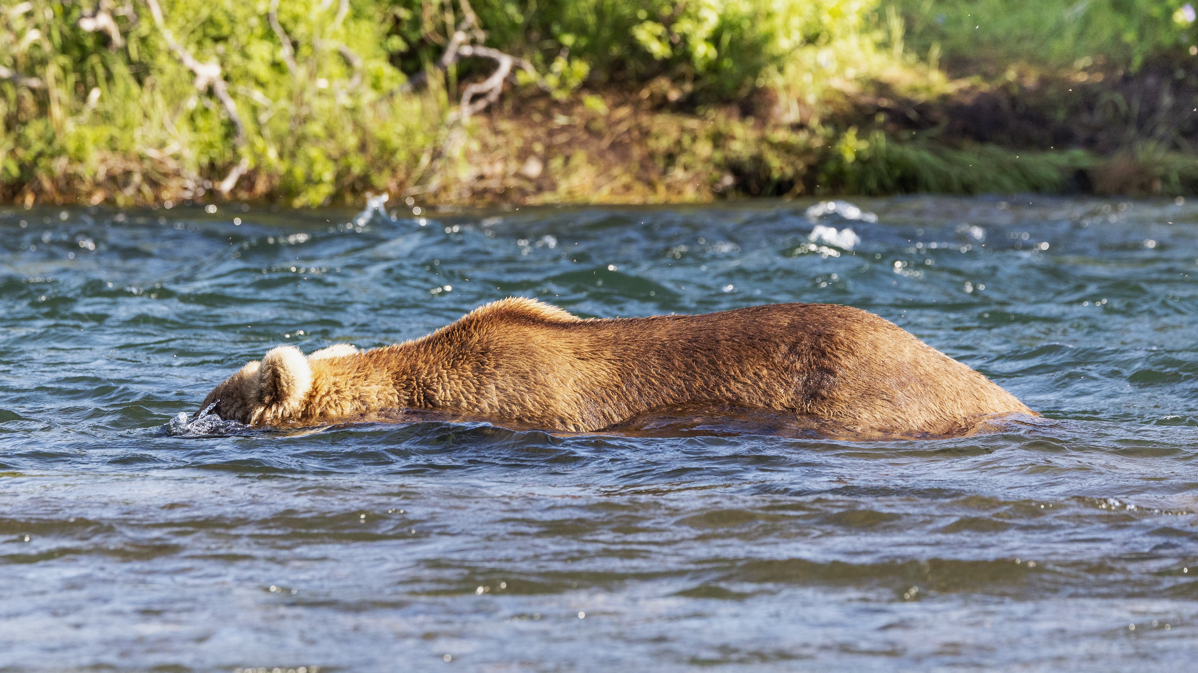 There are several strategies to catch fish, the most common is the dive and grab with the mouth, but some bears develop a very efficient technique of snorkeling with the current and step at the fish.
