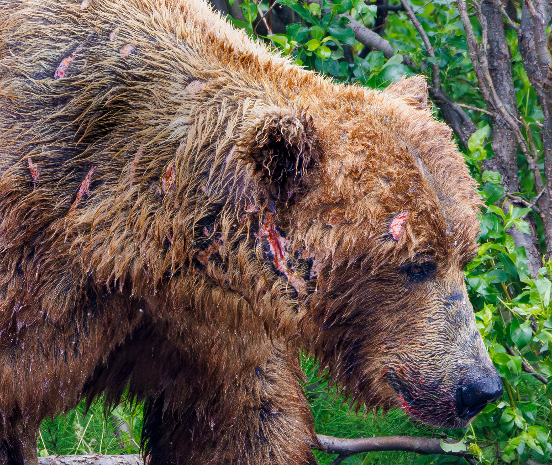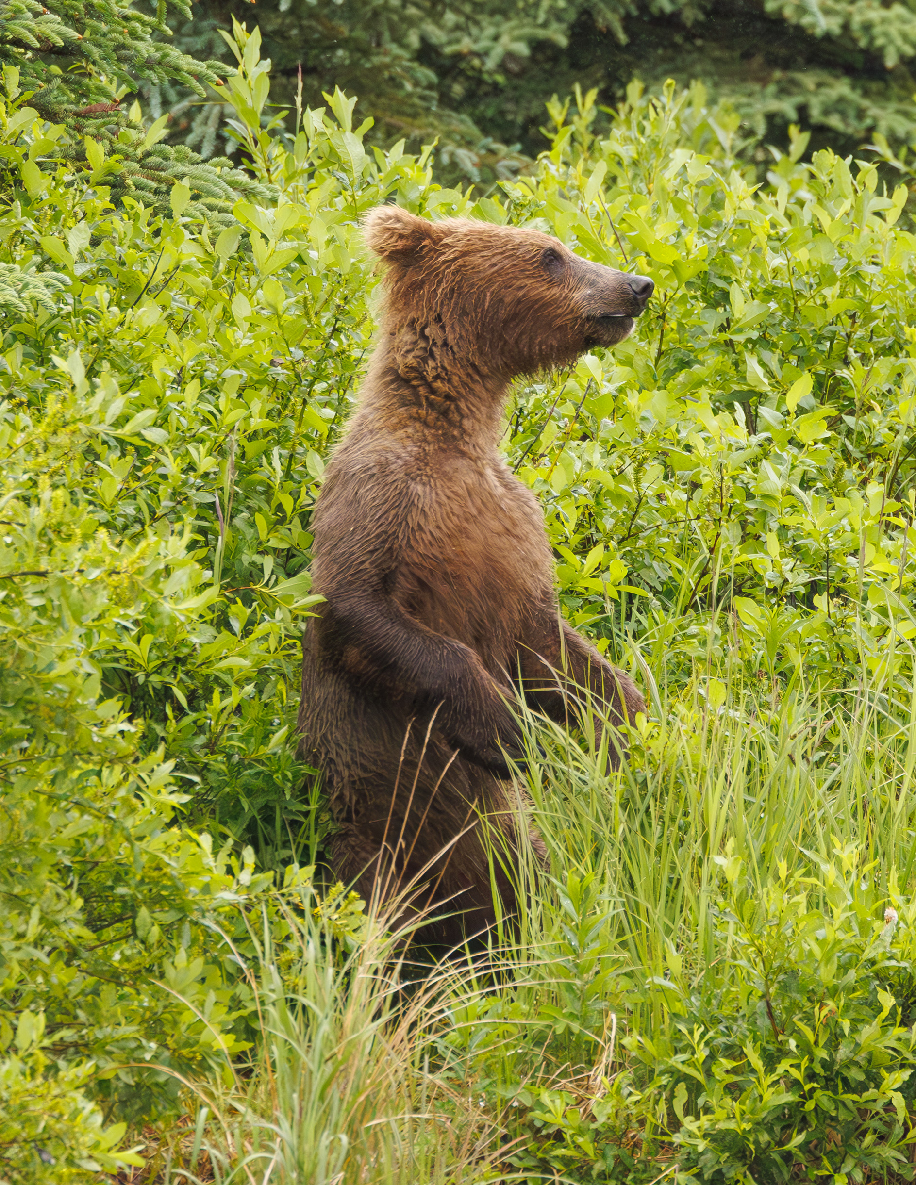 A mother bear, or sow, is fiercely protective, especially this time of year when male bears are hungry. The river is cleared and divided; the most productive side of the river, where the salmon runs more abundantly, belongs to the strong males. The other side is mostly used by younger bears and sows with their young.